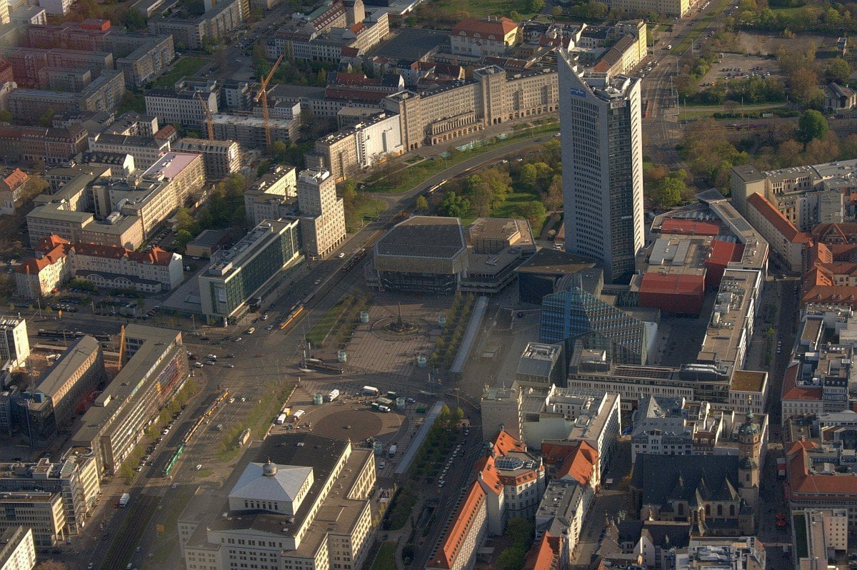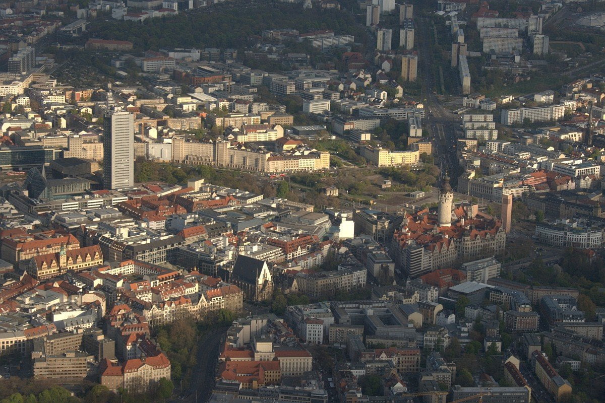 Nun geht es nach Leipzig! Die Silhouette der bevölkerungsreichsten Stadt Sachsen können wir von hier aus schon deutlich sehen. Vorbeifliegend an den Seen bei Naunhof und Kleinpösna erreichen wir den Ostrand von Leipzig. Hier schauen wir uns zunächst einmal das kurz „Völki“ genannte Völkerschlachtdenkmal an und widmen uns dann der Leipziger Innenstadt, über welcher wir einen weiten Kreis drehen.