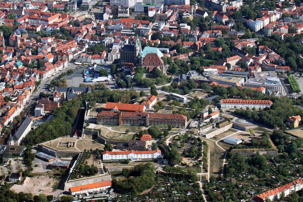 Kurze Zeit später befinden wir uns bereits am westlichsten Zipfel kurz vor der hessischen Landesgrenze, wo die Wartburg hoch über Eisenach thront. Nach einer Runde über der Lutherstadt geht es vorbei an Hainich und Hörselbergen weiter nach Gotha. Von da aus erreichen wir wenige Minuten später die Landeshauptstadt Erfurt und können den Dom und die Festung Petersberg aus der Luft bewundern.